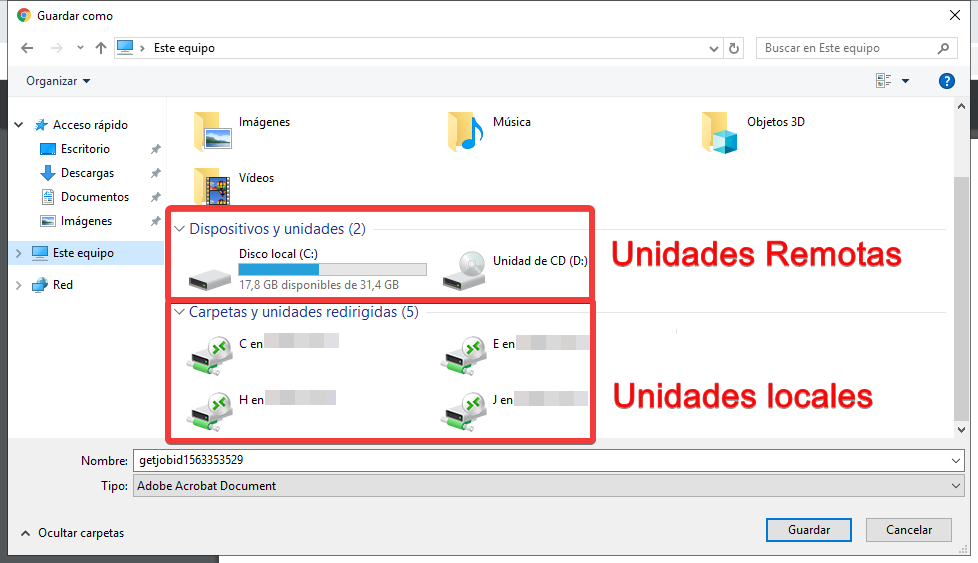 Debajo de “Carpetas y unidades redirigidas” se encuentran sus unidades locales, debe buscar la unidad donde desee guardar el documento.