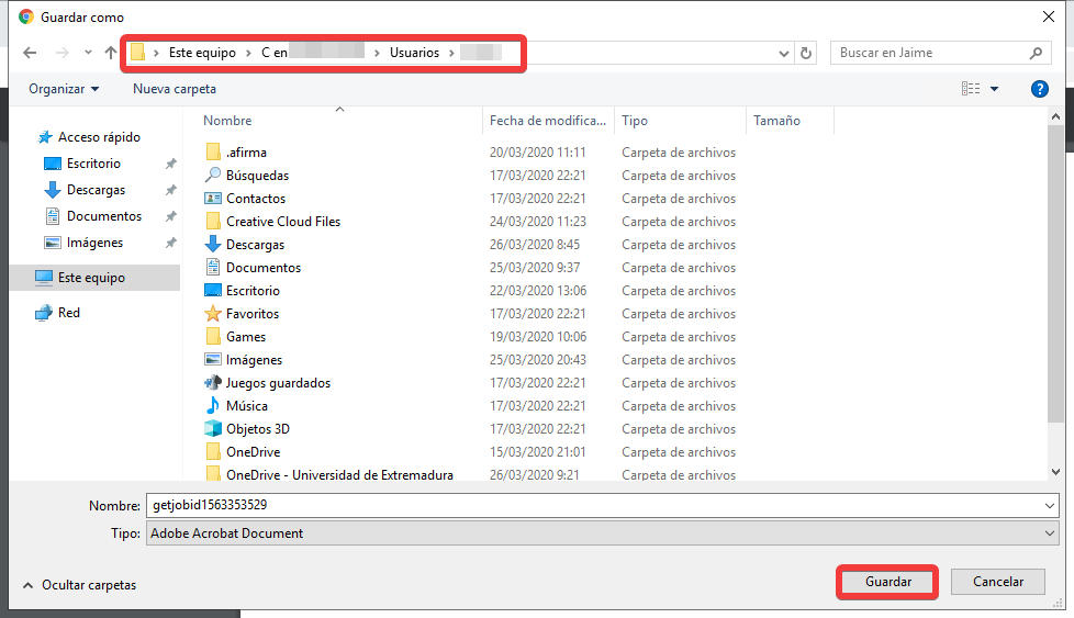 Una vez que hayamos encontrado la carpeta donde vamos a guardar el documento puede cambiar el nombre del archivo y pulse el botón Guardar.
