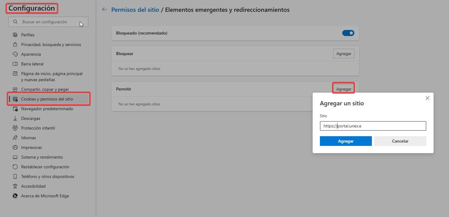 En Microsoft Edge abrir la Configuración, elegimos en la lista de la izquierda «Cookies y permisos del sitio» y nos desplazamos hasta «Elementos emergentes y redireccionamientos«, una vez dentro si está la opción de Bloqueado activada pulsamos en el apartado Permitir en el botón «Agregar«, ahí escribimos https://portal.unex.es y en «Agregar«.