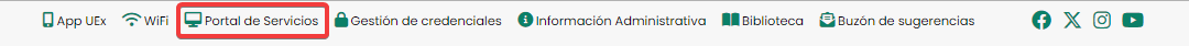 El acceso al Portal de Servicios se realizará desde la página principal de la Universidad de Extremadura o desde cada colectivo como muestran la captura siguiente, y para validar la autentificación del usuario se utilizarán el IDUEX y el PinWeb correspondientes.
