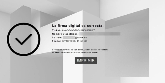 11. Una vez finalizado se le mostrará una página con el resultado de la firma donde podrá descargarse el recibo al pulsar en “Imprimir”.